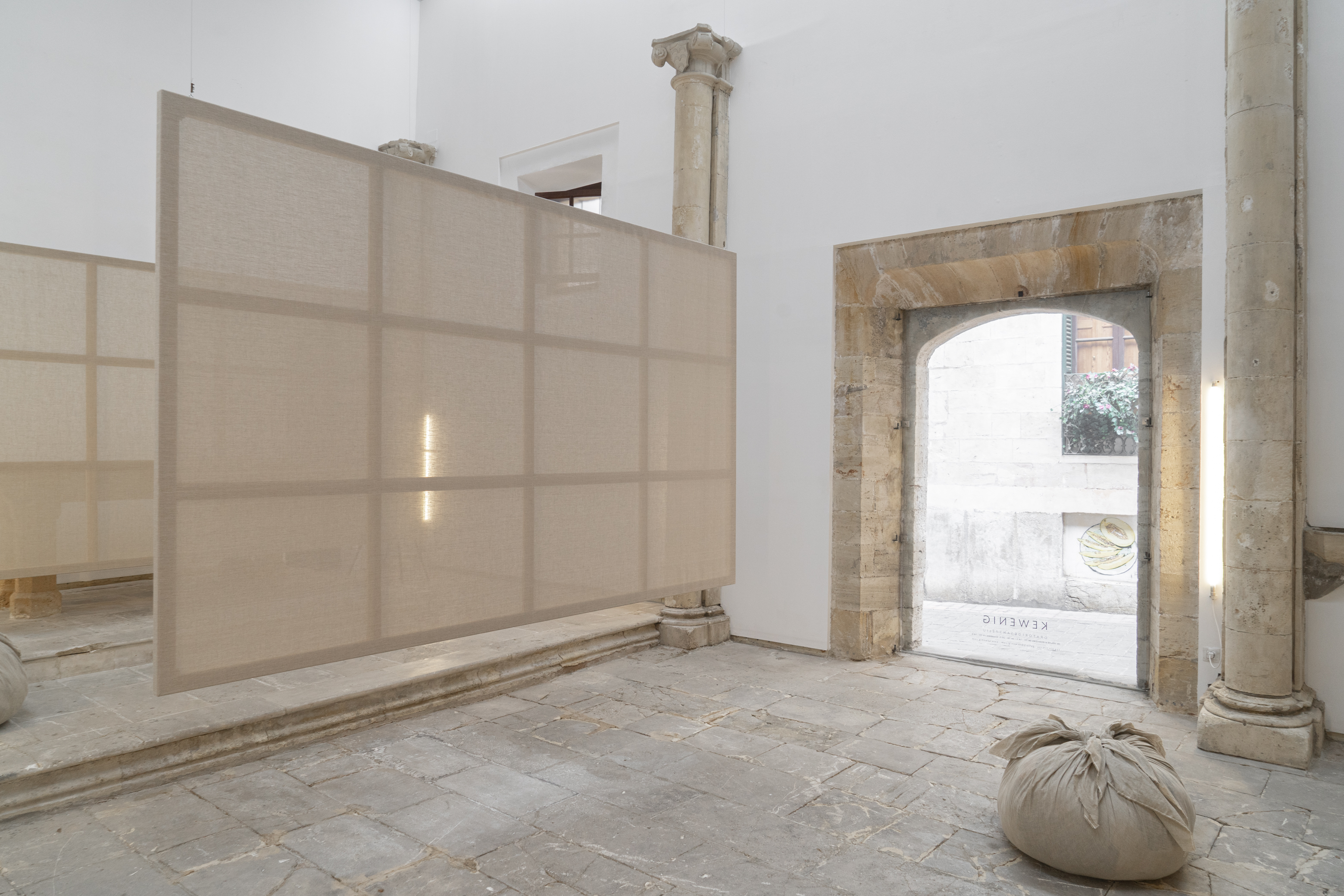 Three stretched but unpainted canvases hanging freely in the room, as well as three bundles of the same fabric of natural fibers distributed on the floor, are works by the Korean artist Kimsooja that KEWENIG Palma is showing in the Oratori de Sant Feliu as an installation titled Meta-Painting.